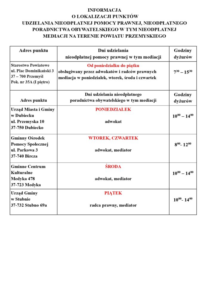 Lokalizacja i harmonogram dyżurów Nieodpłatnej Pomocy Prawnej w Przemyślu/ Nieodpłatnego Poradnictwa Obywatelskiego w roku 2026