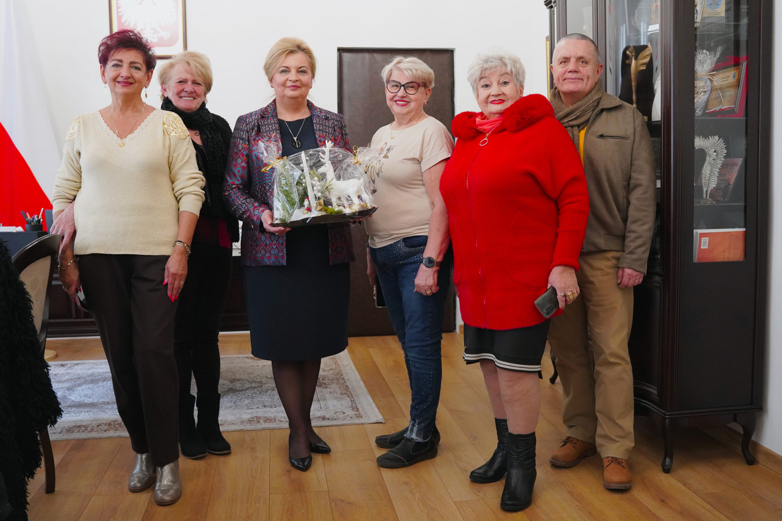 Wizyta była związana ze zbliżającymi się Świętami Bożego Narodzenia. W serdecznej i sympatycznej atmosferze Starosta przyjęła moc ciepłych życzeń. Pani Starosta została również obdarowana pięknym, własnoręcznie wykonanym przez Seniorów rękodziełem o tematyce świątecznej – urokliwym stroikiem.
